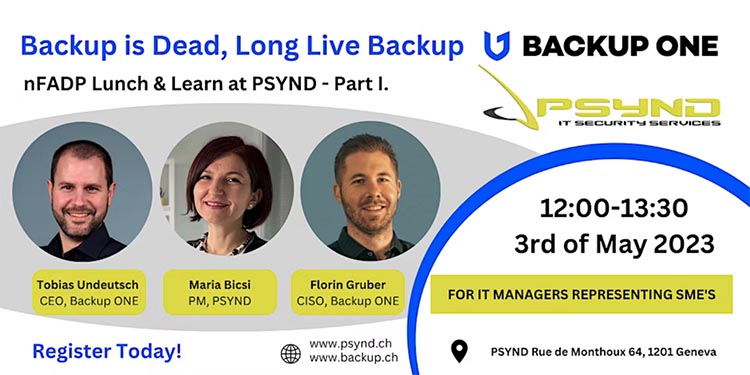PSYND is inviting you to a Lunch & Learn series with its partnes to help your preparation to the nFADP compliance. The first event will take place at PSYND's offices in Geneva together with Backup ONE.