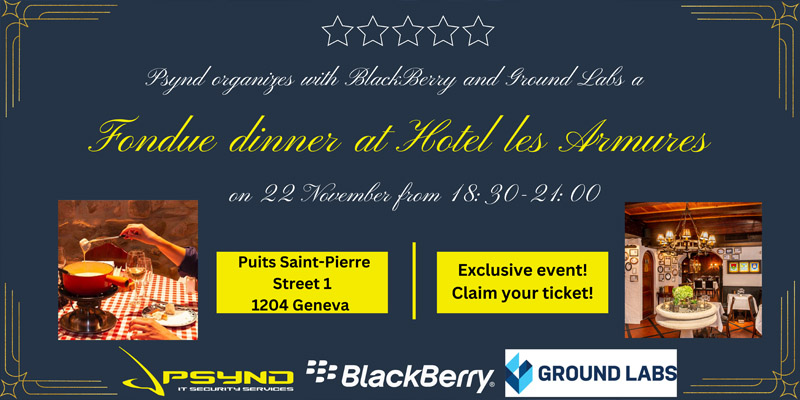 Following the success of the Swiss IT Forum and our two demonstrations, we are delighted to announce that we are organising, in partnership with BlackBerry and Ground Labs, a convivial fondue dinner at the Hôtel Les Armures on 22nd of November from 18h30 to 21h00.